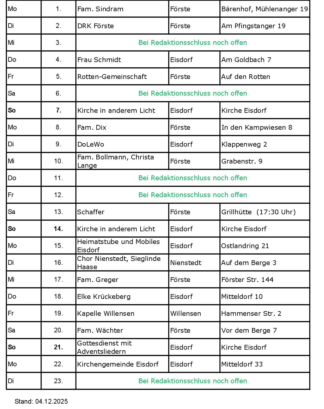 ... das sind viele Menschen, die sich Abend für Abend treffen, singen, beten, eine Geschichte hören und so den Advent bewusst erleben.Jeden Abend sind wir vor einem anderen Fenster in unseren Dörfern eingeladen. Nach der Andacht ist Zeit, noch ein bisschen gemütlich zusammen zu stehen und zu klönen. Dazu kann es einen Tee oder etwas Kinderpunsch geben, vielleicht auch noch ein paar Kekse.