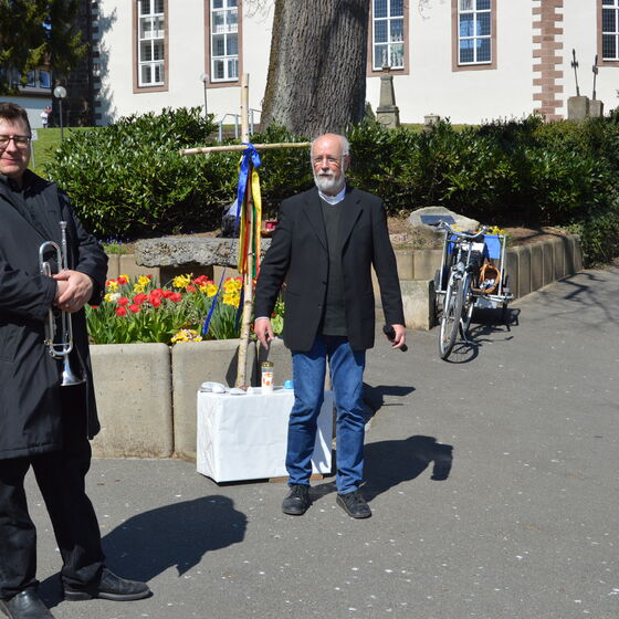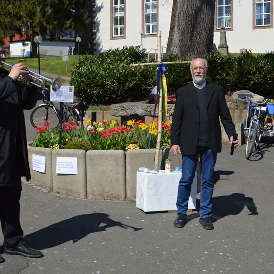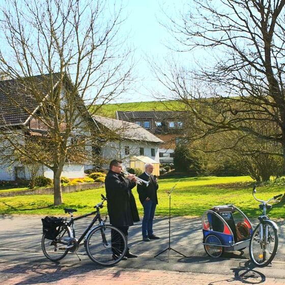 Pastor Teicke und Rinaldo Eisel, Lehrer an der Seesener Musikschule, sind mit Fahrrad und Musikanlage durch Förste und Nienstedt gefahren und haben an vielen Stellen nach einem kurzen Glockengeläut Osterlieder gespielt und gesungen, sehr zur Freude der Zuhörerinnen und Zuhörer.