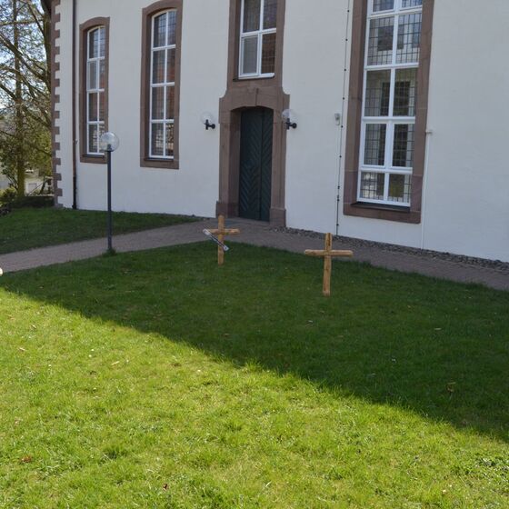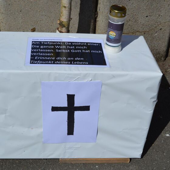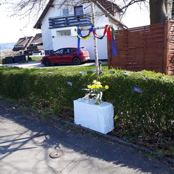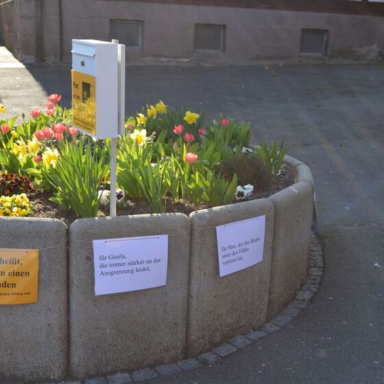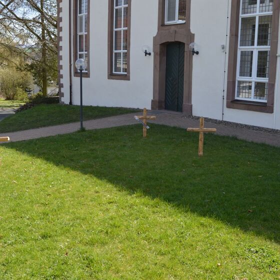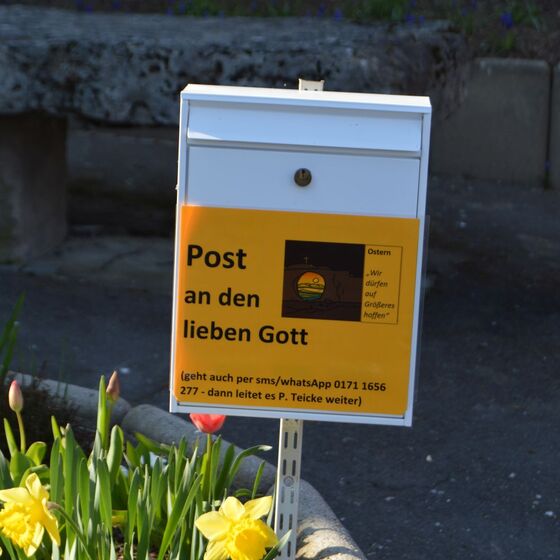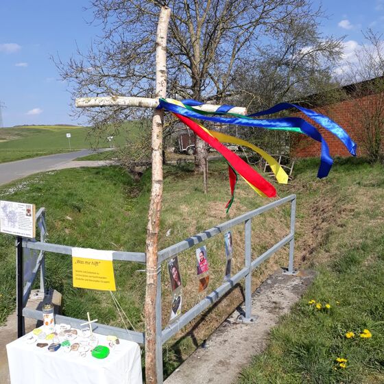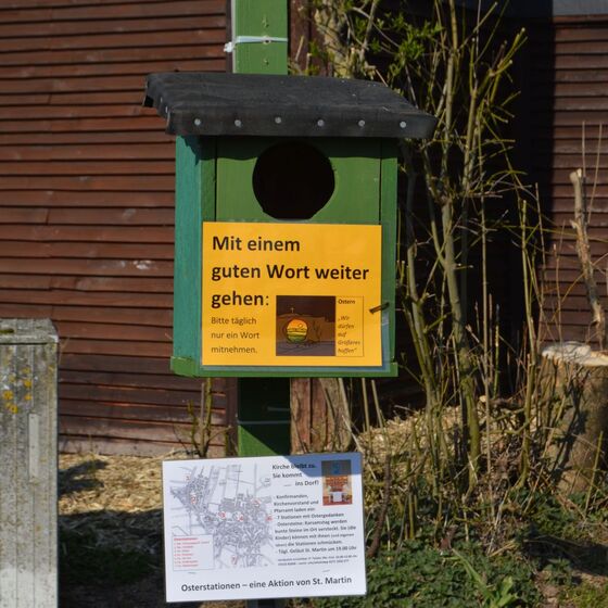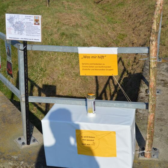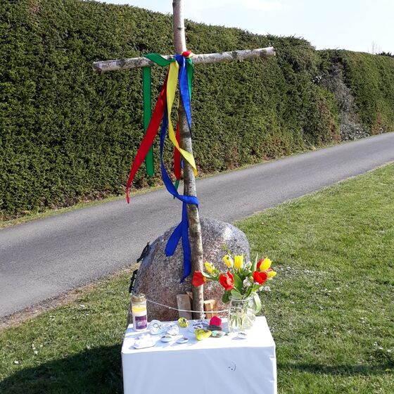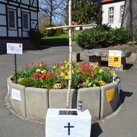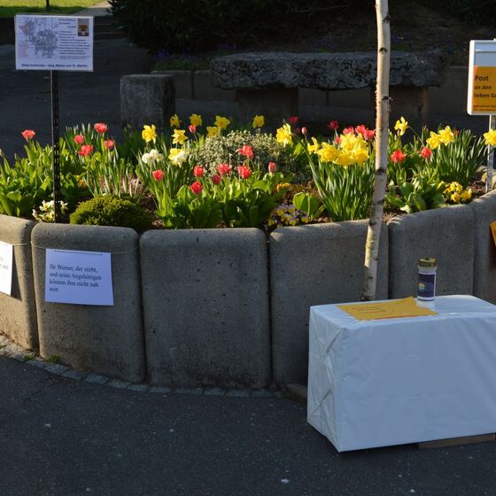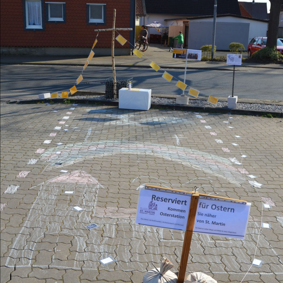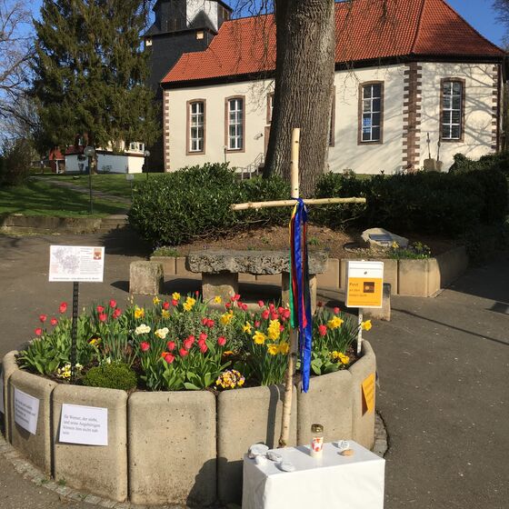 Die am Anfang der Karwoche vom Kirchenvorstand aufgebauten Osterstationen wurden vielfach erweitert. Jede Station mit einer individuellen Botschaft, zur Besinnung und zum Mitmachen. Ab Ostersonntag mit Blumenschmuck und Ostersteinen.