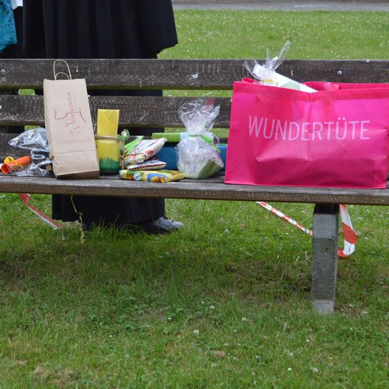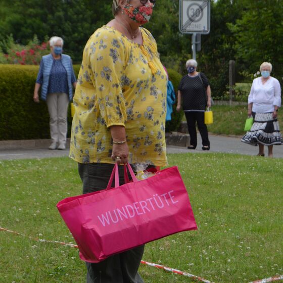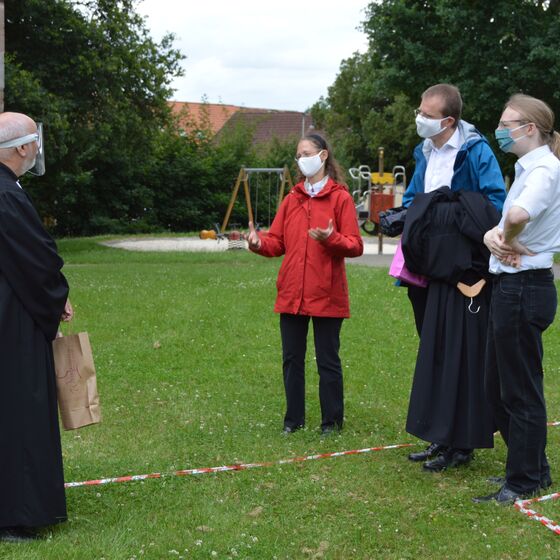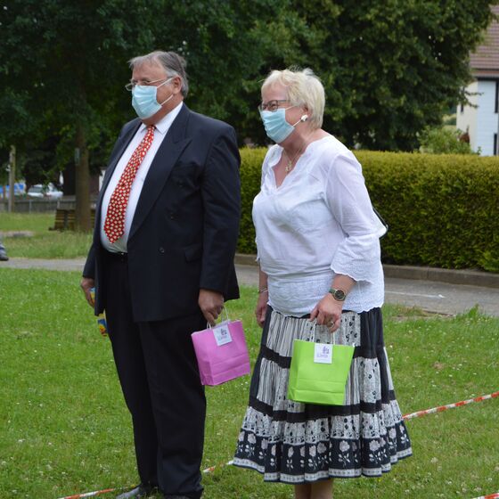 Anstelle eines Gemeindefest mit Getränken, Gegrilltem und Dankesreden im Pfarrgarten erhielten alle Gottesdienstbesucher eine Tüte mit Mini-Getränkeflaschen und Knabbersachen zum Verzehr nach dem Gottesdienst.