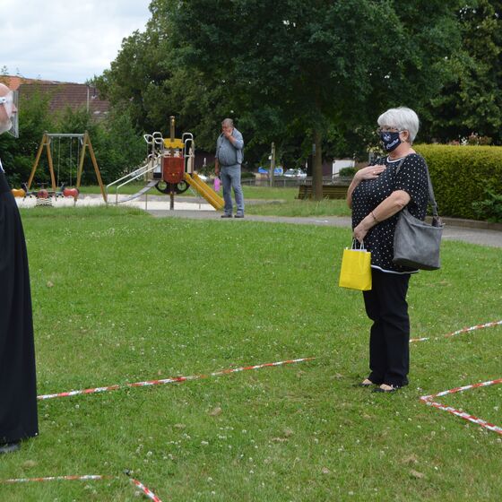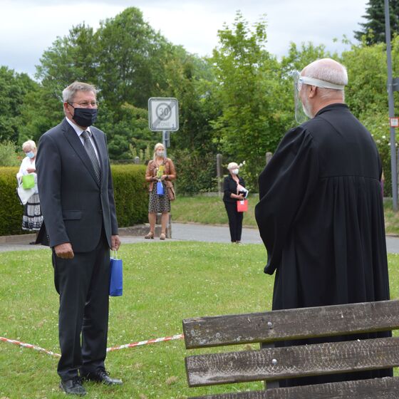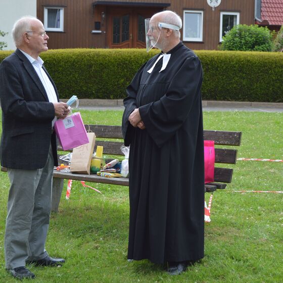 Für eine persönliche Begegnung mit Pastor Teicke war vor der Kirche ein besonderer Bereich markiert, in dem sich Pastor Teicke i.R (im Ruhestand) nach dem Gottesdienst von vielen der Anwesenden "auf Abstand" verabschieden konnte.