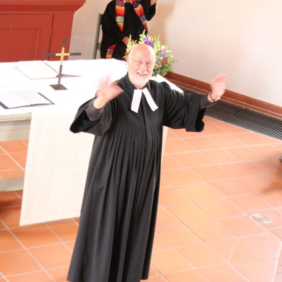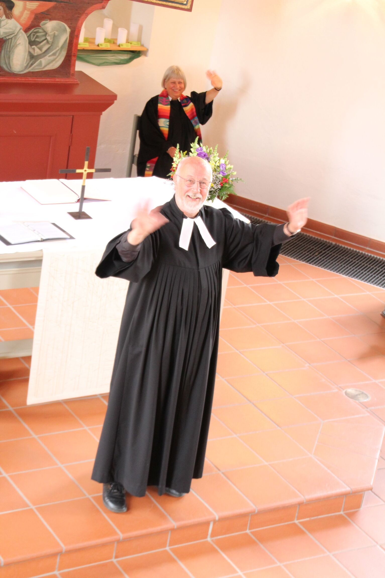 Dr. Ing. Uwe Brinkmann, der von 2011 bis zum Amtsantritt von Pastor Teicke im Jahr 2013 Übergangspastor war, trat jetzt als stellvertretender Superintendent vor den Altar, um vor der Entpflichtung seines Amtskollegen auch an eine amüsante Begebenheit zu erinnern. Denn zu einem Konfirmationsunterricht, der unter dem Thema „Taufe“ stand, hatte er eine mit vielen Dingen befüllte Kiste mitgebracht, von denen sich jeder eine Teil herausnehmen sollte. Ein Jugendlicher kramte mit der Begründung „Ich brauche Wolle zur Taufe“ ein Wollknäuel heraus. Genau zu dem Zeitpunkt kam Pastor Wolfgang Teicke, der als „Wolle“ bekannt ist.
