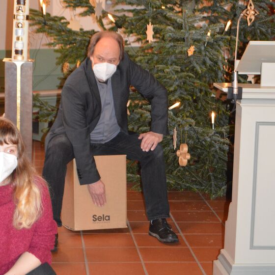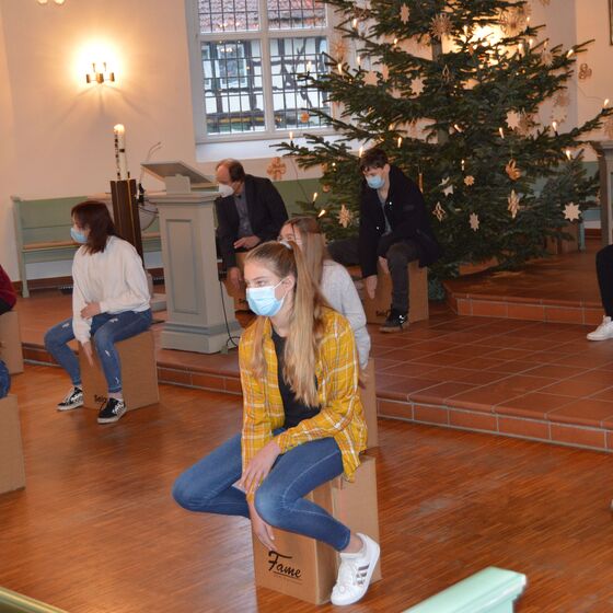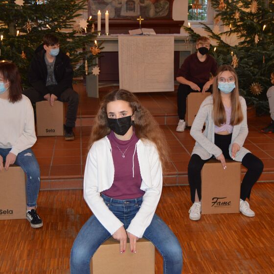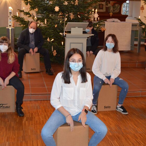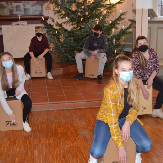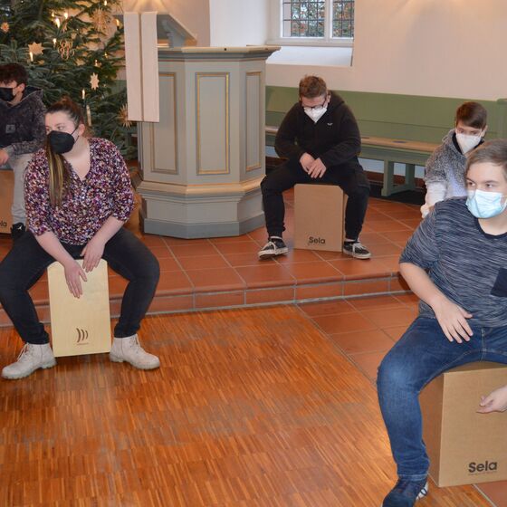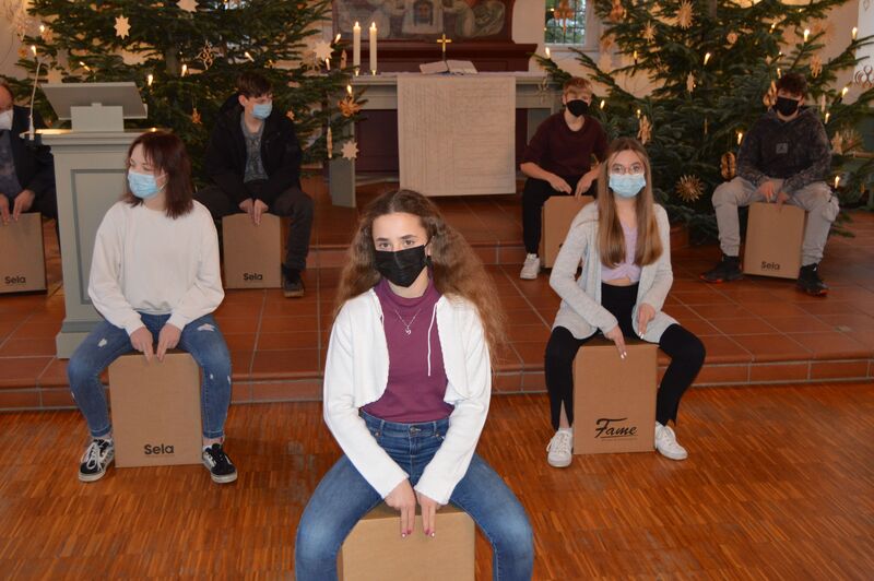 Ordentlich laut war es im Gottesdienst, als 13 Konfirmandinnen und Konfirmanden von St. Martin Nienstedt-Förste zusammen mit Pastor Rumberg-Schimmelpfeng unter Leitung von Frank Bode mehrere Lieder rhythmisch mit der Cajon untermalten.