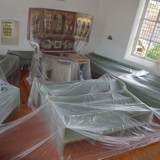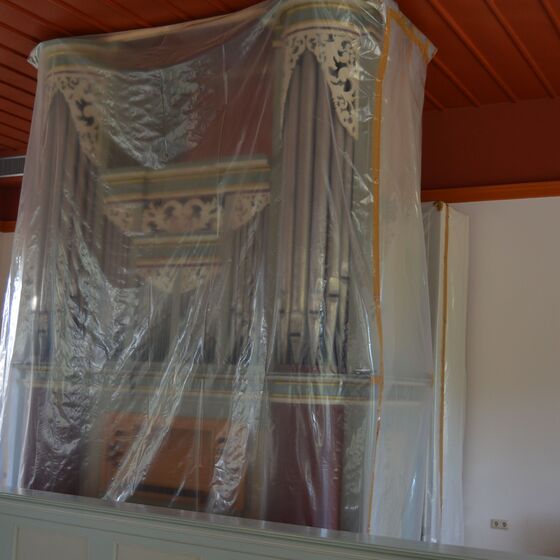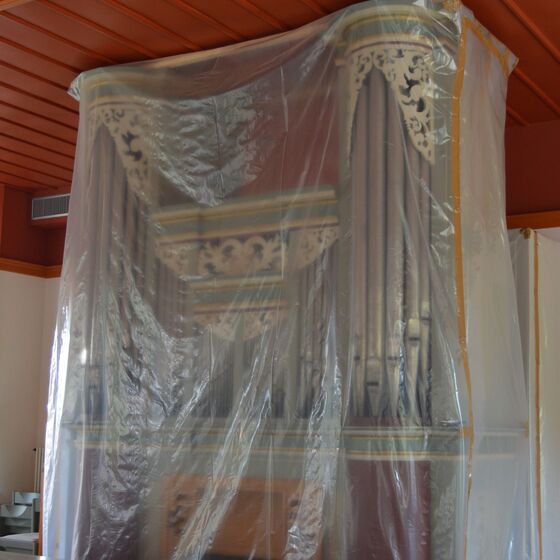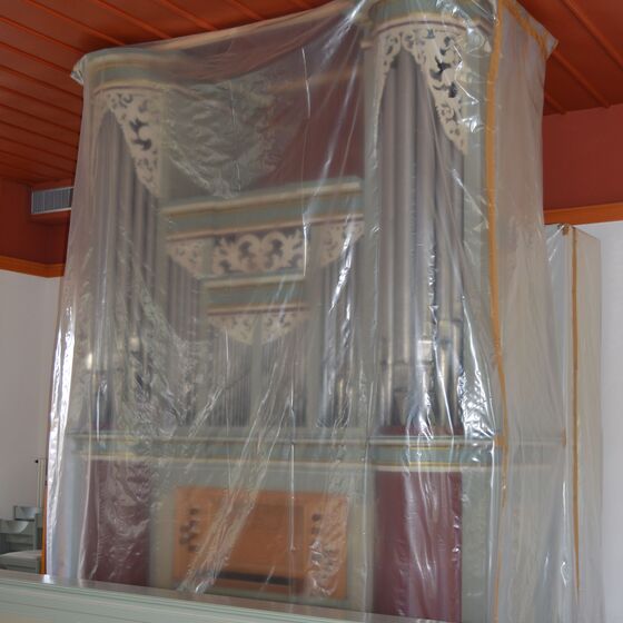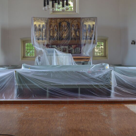 Dazu wurden die Orgel, die Kirchenbänke und der Altar staugeschützt abgedeckt.