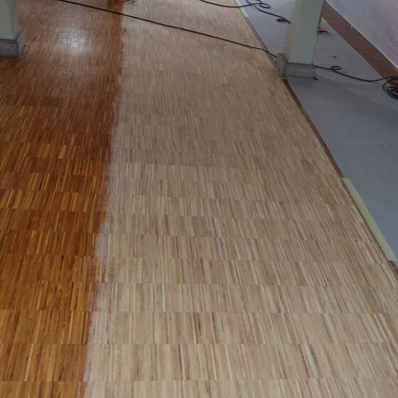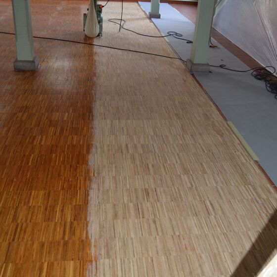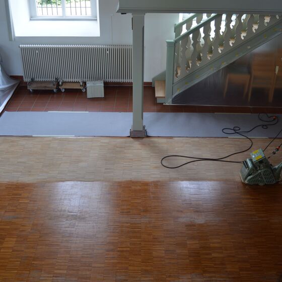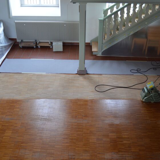 U.a. wird der Parkettfußboden im Kirchen- und Gemeinderaum abgeschliffen und neu versiegelt, sowie schadhafte Stellen an den Wänden ausgebessert und neu gestrichen.
