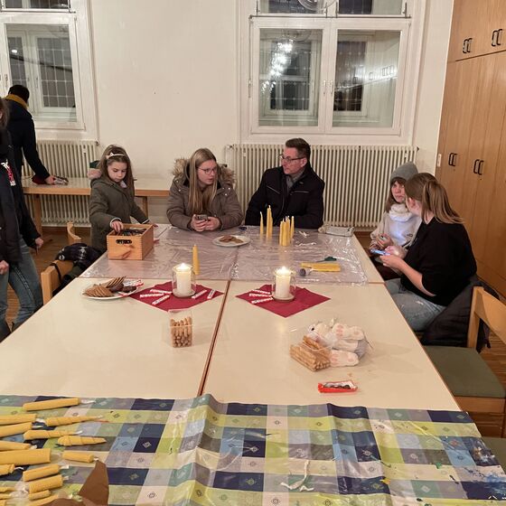 Nach dem Gottesdienst wurde zum Treffpunkt mit Gebäck und Heißgetränken vor der Kirche und zum Basteln von Kerzen in den Gemeindesaal eingeladen. Das Kerzebasteln wurde von Klein und Groß gut angenommen (Es soll seit dem Familiengottesdienst eine Familie in Förste geben, die jetzt Kerzen für einen vollständigen Wichern-Adventskranz hat!).