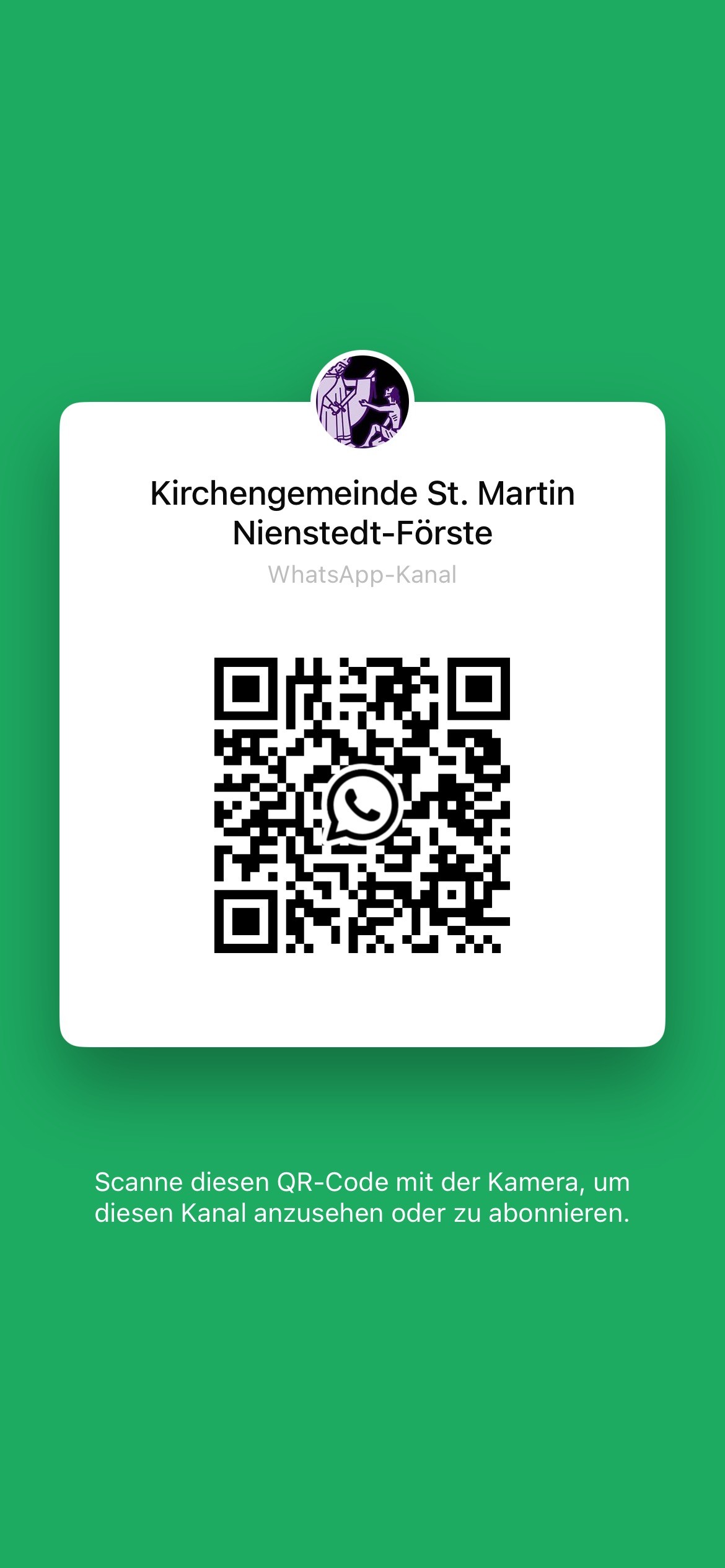 Bekanntmachungen, Termine und Informationen der Kirchengemeinde St. Martin Nienstedt-Förste werden nun auch per WhatsApp-Kanal veröffentlicht. Einfach den QR-Code scannen und den Kanal abonnieren.