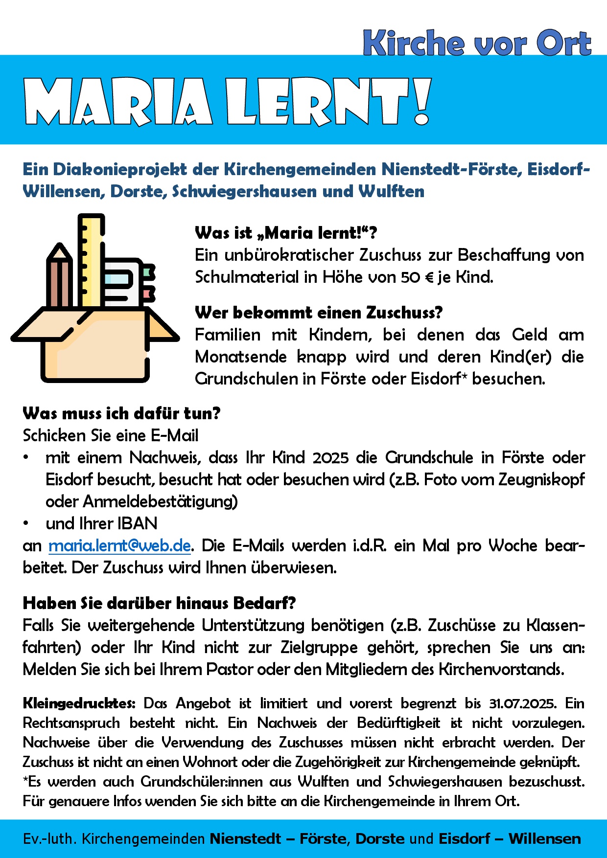 Es richtete sich an die Familien aller Grundschülerinnen und Grundschüler unserer Orte, bei denen es am Monatsende finanziell etwas eng wird – egal, ob ein Anspruch auf Sozialleistungen vorliegt oder nicht. Unbürokratisch können Zuschüsse für Schulmaterial in Höhe von 50 Euro je Kind beantragt werden. Die Zuschüsse werden aus den „Diakoniekassen der eigenen Gemeinde“ finanziert, für die in unseren Gottesdiensten gesammelt wird. Alle Details entnehmen Sie dem Plakat.